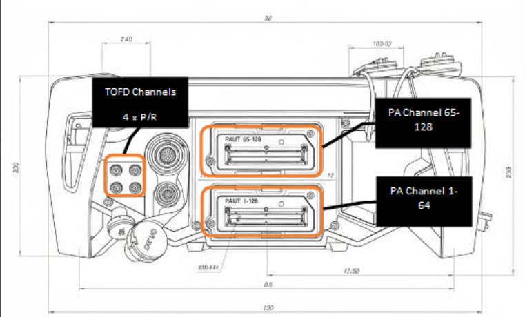 The hardware has some remarkable features such as the double IPEX connectors, which omit the need for splitters and therefore avoid the additional noise introduced by these splitters, ultimately increasing the Signal to Noise Ratio (SNR). The unit also has 4 conventional channels that can be used in both pulse and receive mode, allowing for the connection of 2 TOFD pairs during critical inspections on thicker materials. If Eddyfi Technologies’ probes are used, the PA probes will automatically be recognized by the software and all settings for the probe set in the software.