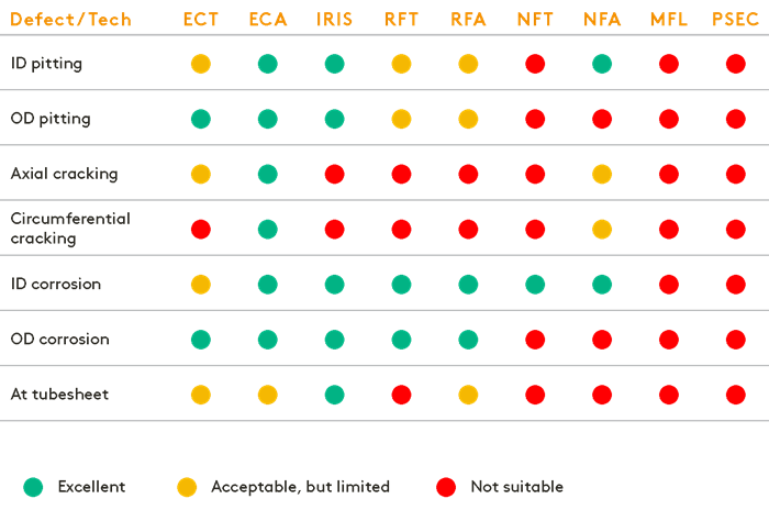 The most common defect that asset owners and inspection companies search for are pitting and corrosion, longitudinal cracks, circumferential cracks especially at the tubesheet, erosion, fretting and metal loss. Detecting these defects early enables optimal performance and of course the prevention of critical failure. No individual non-destructive testing (NDT) technique is adequate for all tubing applications, types of materials and defects.
