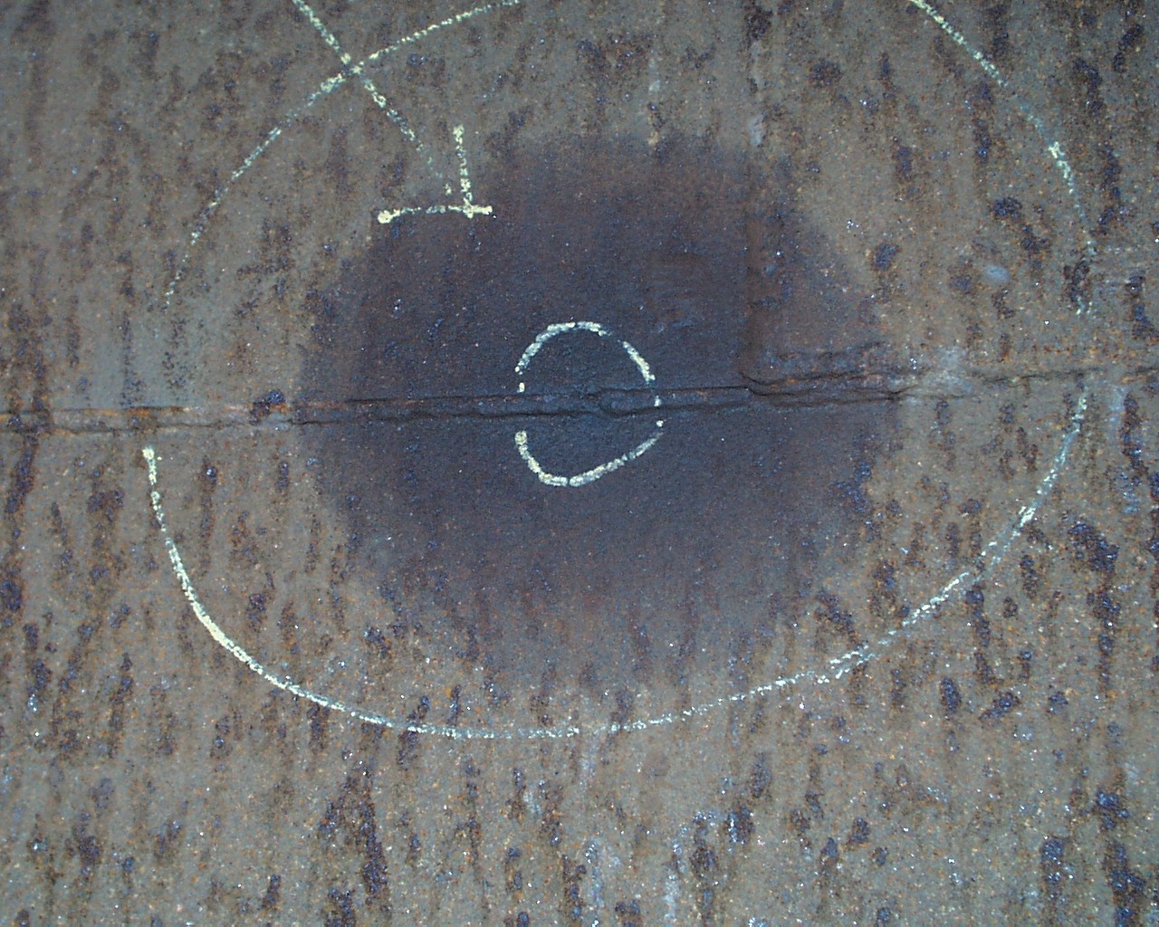 Ultrasonic testing was employed to survey the tank shell with no significant thinning detected. A leak was noted on a shell plate weld during this inspection. Although the perforation in the weld was extremely small, it was easily identified by a characteristic circular damp area caused by leaked product being drawn back into the tank due to capillary action. This was remedied using a “chemical metal” compound.
