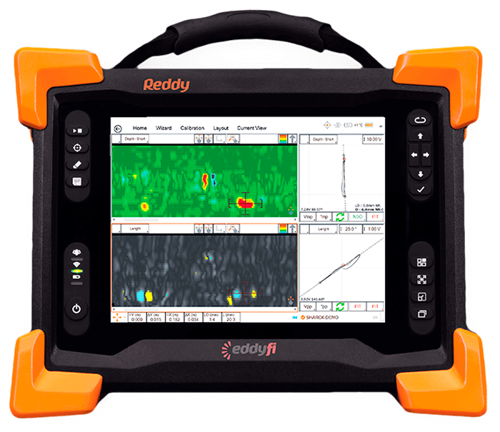It is sensitive to cracks in all orientations, detecting anomalies in a single pass. Scanning is performed at speeds up to 600 millimeters (24 inches) per second over a 200-millimeter (8-inch) area. The Spyne works in combination with Reddy®, a robust and portable ECA instrument featuring a large touchscreen that displays color-coded maps, C-scans, generated by the tool. The easily interpreted data maximizes productivity for the detection of SCC on pipelines.