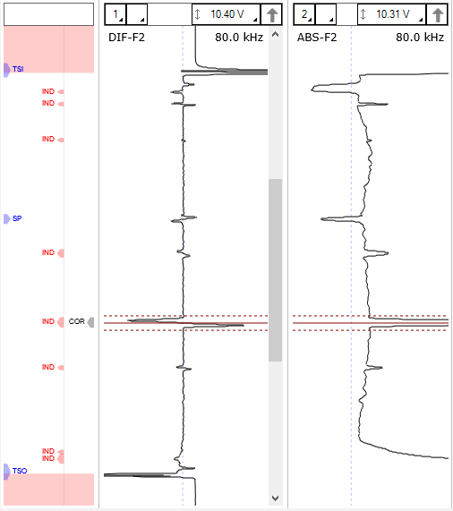 Tubing inspections frequently uncover numerous indications in each tube, sometimes reaching up to hundreds. To assist analysts in identifying the most essential indications, a "grouping" feature has been provided. This allows analysts to group the indications based on their amplitude and phase ranges, rapidly highlighting the most significant ones. This capability not only boosts productivity but also increases confidence by reducing the likelihood of missing defects. In Figure 3, the information pane located at the bottom-left displays the indications by group. Upon selecting an indication from the pane, the cursor in the data file will automatically move to facilitate appropriate sizing measurement.