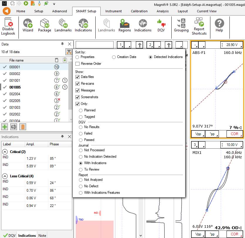 Second, filtering allows analysts to display only tubes with specific logbook information such as DQV test results or those with potential indications, enabling a quicker assessment of data integrity. For example, let's take a data set consisting of 400 tubes and assume an analyst has enabled all tools. Before starting the analysis, a filter is applied to the data list to show only tubes with potential indications. If the result is 40 tubes showing indications, this means that without even opening a data file, the analyst already knows that 90% of the tubes have potentially no indications and are most likely to be marked as defect free or no defect detected. This means that the bundle is mostly free of defects and the analysis will be short. Note that the opposite is also true, if 360 out of 400 tubes have potential indications, it means the majority of the tubes have potential indications and the analysis will take longer.