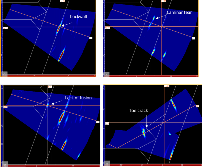 The following images show sectorial scans for four different locations superimposed on the overlay, in white, on the Y weld. The top left image shows a sectorial scan with no defect. The alignment of the echo with the backwall of the overlay indicates that this echo is a geometric echo and not a defect one. The three other images show a laminar tear, lack of fusion, and a toe crack, respectively. Their position along the overlay helps operators interpret the nature of the defects and thus their gravity to the integrity of the structure. It is worth noting that the sectorial scan for the toe crack was reconstructed after a rebound off the opposite surface to allow correct positioning of the toe crack echo. Capture allows as many reflections as an operator wants.