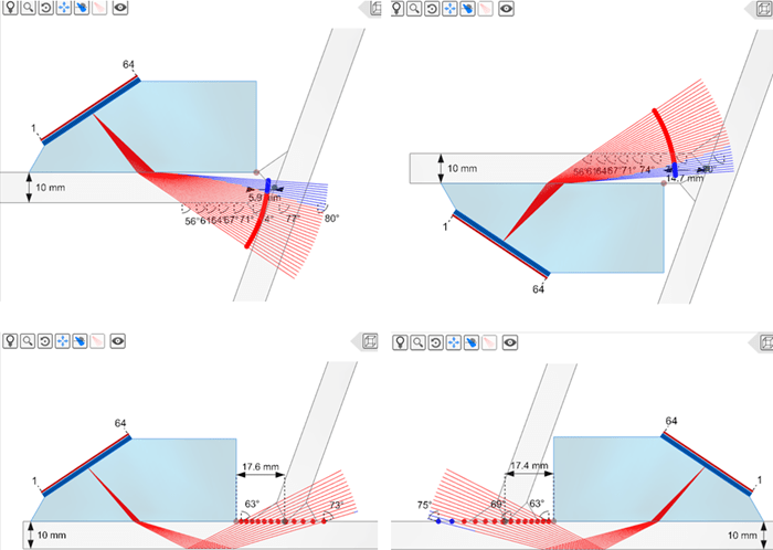 Request a quoteThe following images show scan plans for a position on each surface of a Y welded joint. The ray tracing together with annotations such as the refracted angles, thickness, and index offsets allow operators to see coverage of the welded joint. Near field information indicated by the two colors of the rays indicates to operators whether they can focus the beam on the intended location.