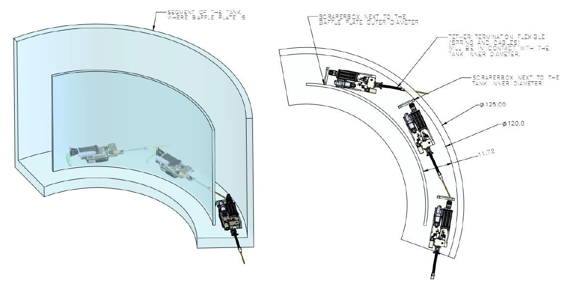 The first end effector was used to scrape or rake foreign objects like bolts from behind the baffle plate while the second end effector was used to pick up and capture foreign objects from the bottom of the pool. The remotely operated crawler was designed to pick up items smaller than 25.4 millimeters high by 63.5 millimeters wide by 63.5 millimeters long (1 inch by 2.5 inches by 2.5 inches) weighing less than 0.9 kilograms (2 pounds), all within the parameters of this application.