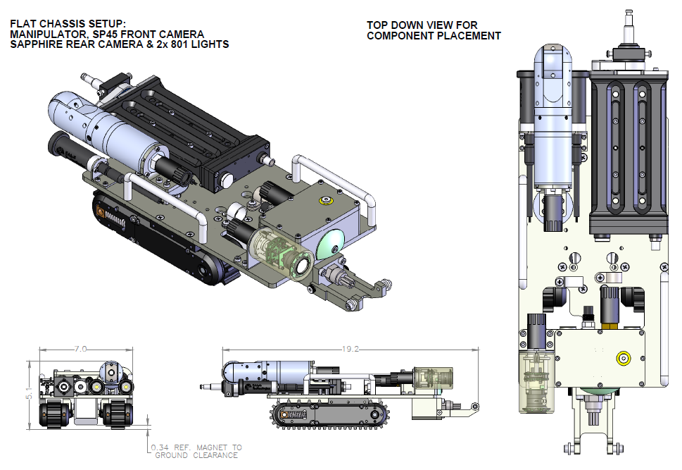Robotics continue to demonstrate their value for remote operations in hazardous environments, and an OnSpec custom solution built on proven modules forming the Foreign Object Search and Retrieval, or FOSAR, crawler system employed here is no exception. The FOSAR robot is based on the Versatrax™ 100 platform with a forward-facing Spectrum™ 45 pan-and-tilt color inspection camera, rear-facing fixed focus camera, 2-axis manipulator drive unit with custom clamshell and scraper jaw sets, all driven by an ICON™ portable controller. The shape and orientation of the custom chassis was built to fit between a segment of baffle plate and the outer tank wall. The entire vehicle weighed 10.4 kilograms (23 pounds), below the limit for safe lifting procedures.