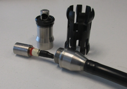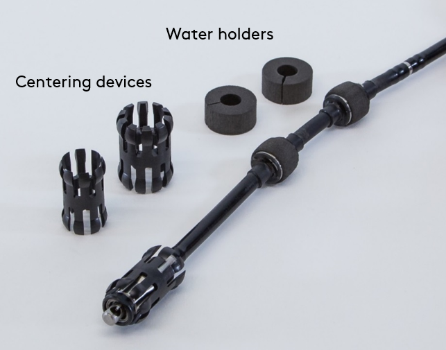 Similarly, two interchangeable foam-loaded holders are used to retain water as the vertical tubes are inspected from their lower end. Just like a standard IRIS probe, the turbine spins as water flows through it. Because of the holders, water collects and floods the tube at the turbine’s location. This simple yet efficient design quickly immerses the probe head and further aids in centering the probe accurately.