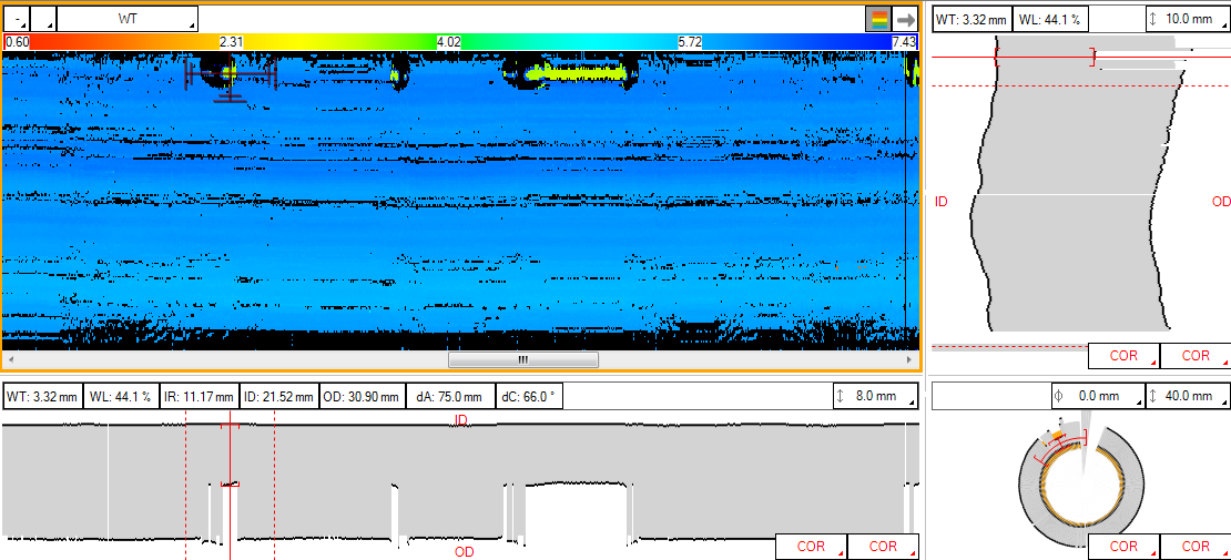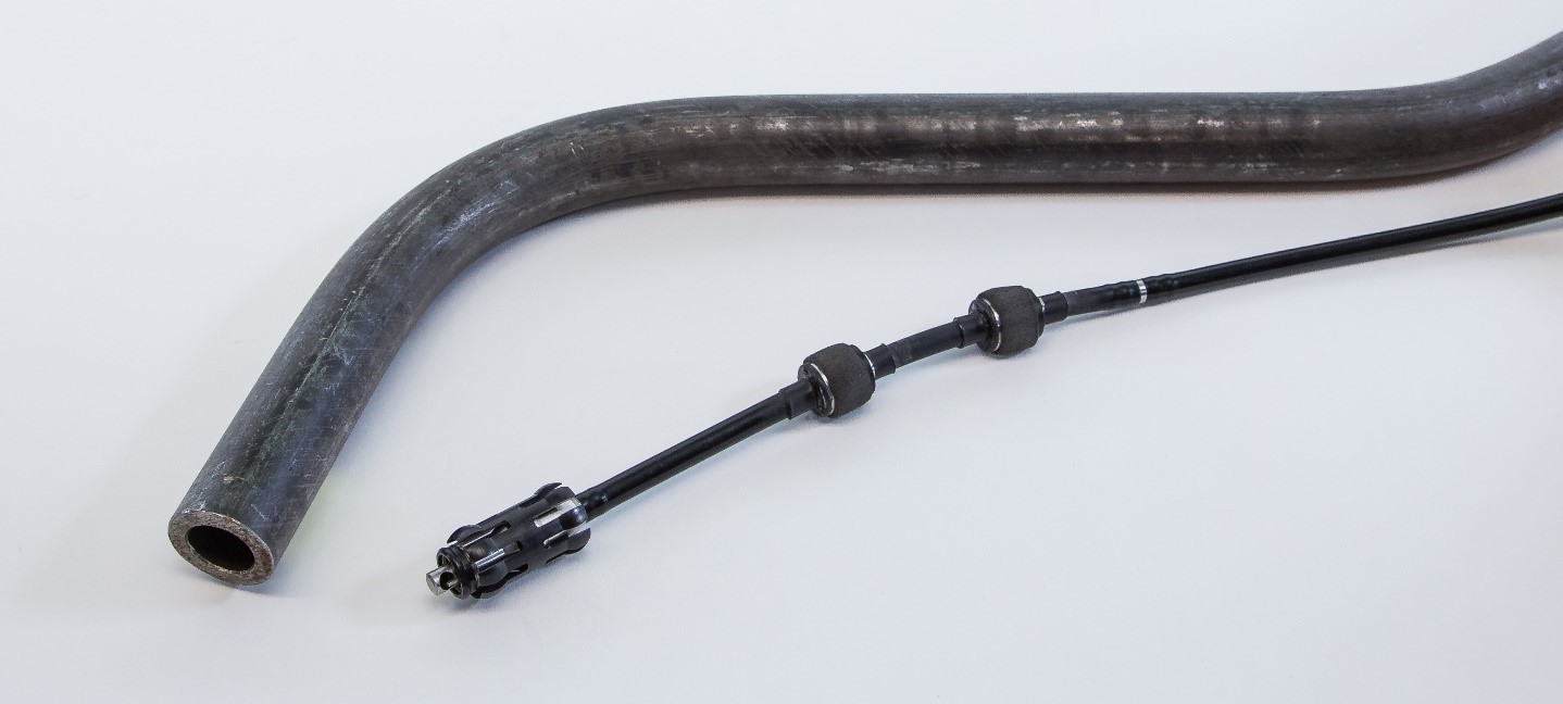 In response to these challenges, we developed a flexible internal rotary inspection system solution that incorporates a centering device integrated with the turbine. This petal-shaped centering device offers the rigidity necessary to keep the turbine properly centered while providing the flexibility required to negotiate bends smoothly. In addition to this feature, the shortened transducer and turbine head prevent the tips of the turbine from rubbing against the tube’s inner surface, ensuring better centering closer to the bends. The versatility of the flexible IRIS probe kit is enhanced by interchangeable centering devices, allowing the inspection of different inner diameter tubes. This probe has been designed to pass through two tube lines featuring a 120-mm (4.7-in) bending radius with a 75-degree elbow. More specifically, this probe can operate in a 31.8-mm (1.3-in) outer diameter (OD) tube with an inside diameter (ID) ranging from 19.8 to 21.2 mm (0.78 to 0.83 in) and a 38.1-mm (1.5-in) OD tube with an ID ranging from 26.1 to 27.5 mm (1.03 to 1.08 in).