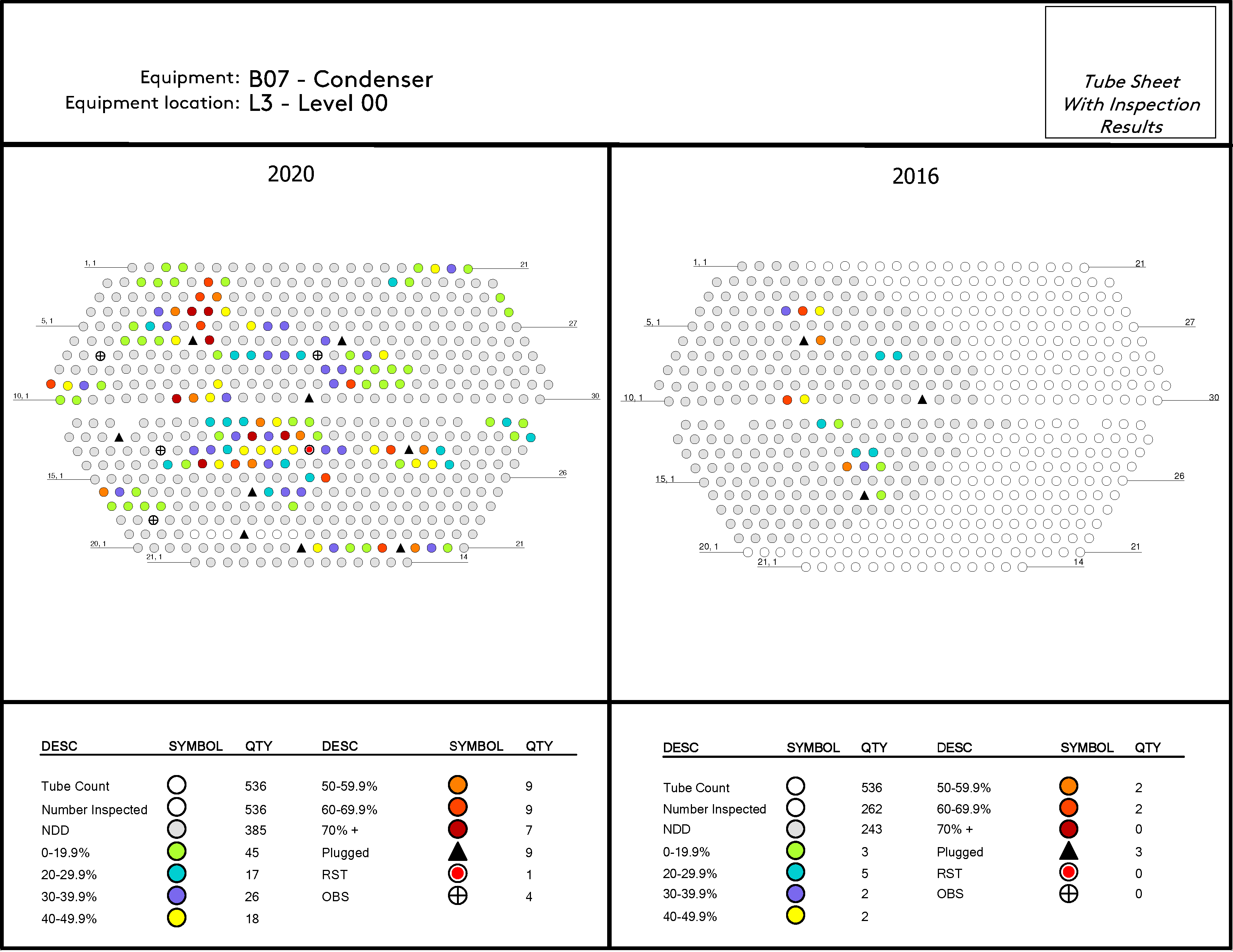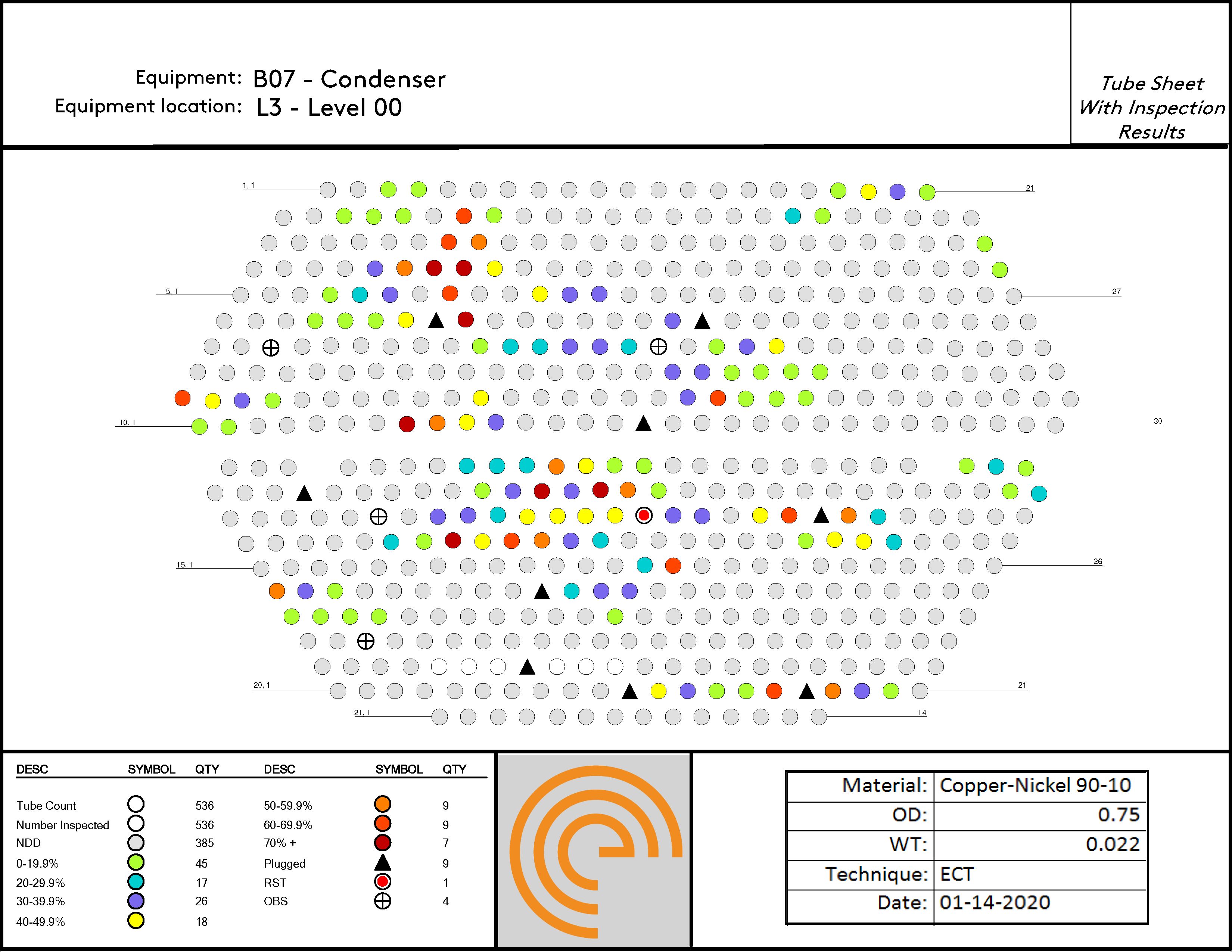 Once data is acquired for analysis, TubePro offers the best tools in the industry to present results in an insightful report. By creating a report template, users can consistently produce a comprehensive report that shows 2D tubesheet mapping of the defects as well as 3D modelling of the chiller. Historical data analysis also offers a better comprehension of the evolution of indications and allows operational managers to be more forward thinking in their approach and better manage their critical assets.