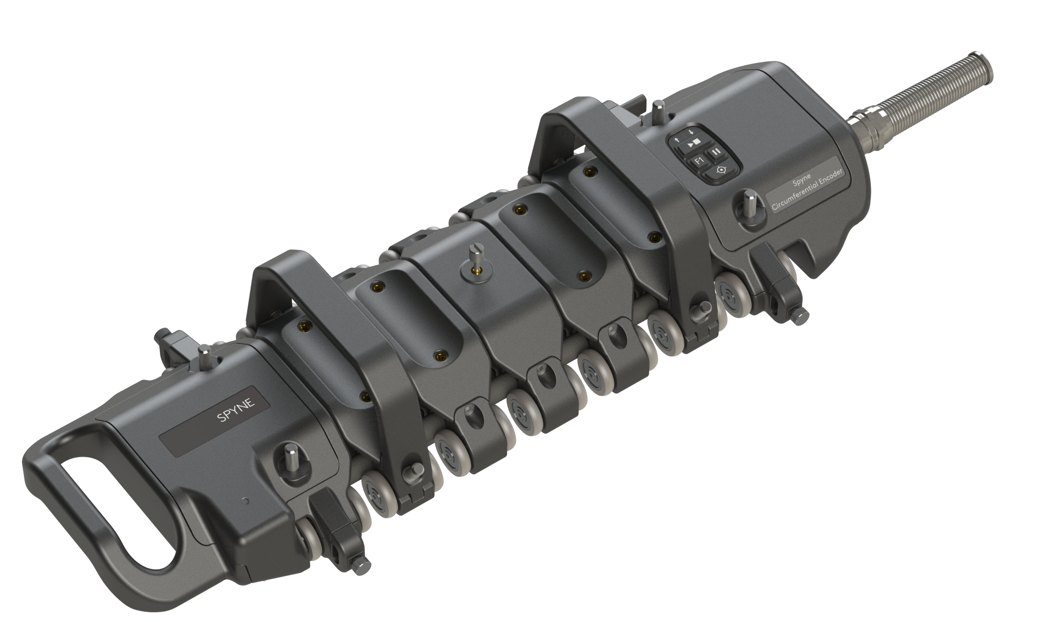 Spyne is encoded both axially and circumferentially and has a coverage of 200mm (8in), maximum scan speed of 600 mm (48in) per second, and optional magnetic wheels to facilitate scanning the sides and bottom of the pipe. Its raster scan capability allows inspection of 100% of the pipe's external surface recorded in a single data file.